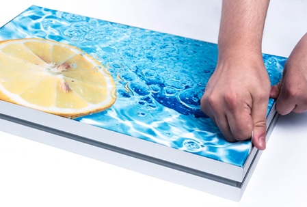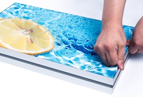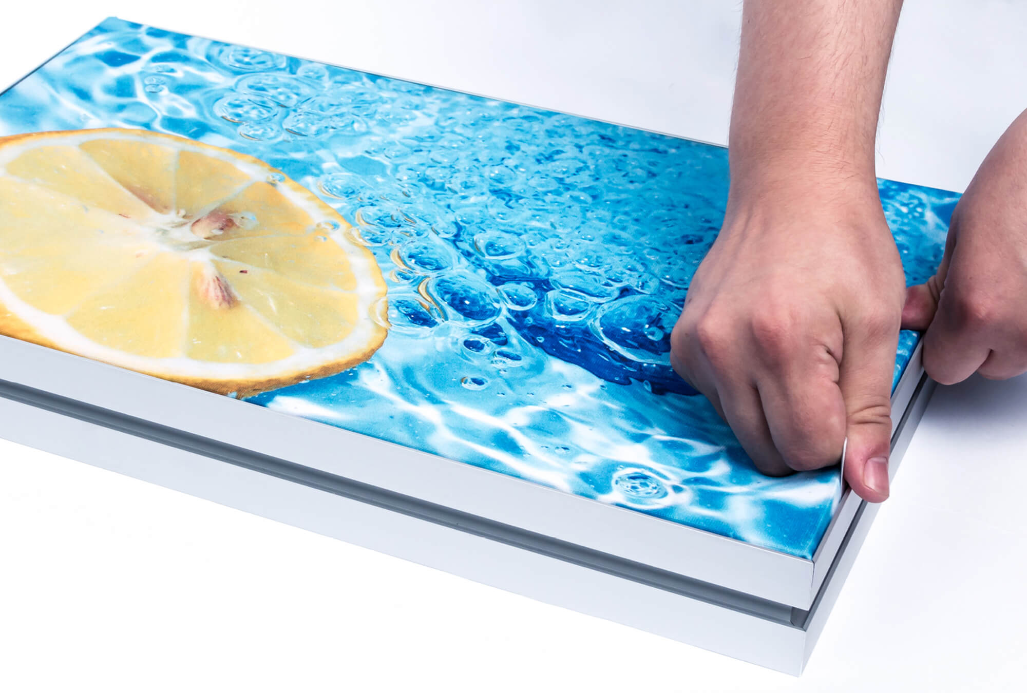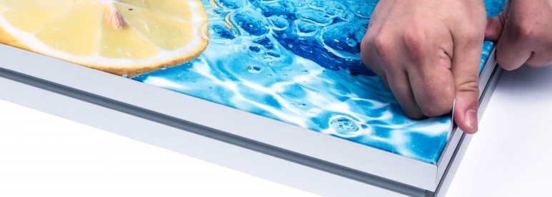 • Montage der Rahmen und Austausch von Textildrucken mit Gummilippe ist ohne Spezialwerkzeug problemlos und schnell möglich. Das macht das System ideal für regelmäßige Motivwechsel