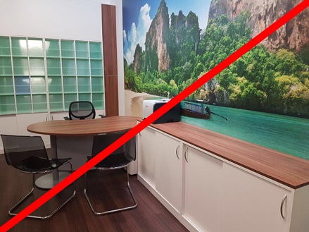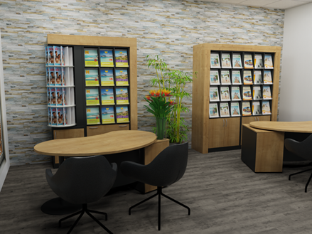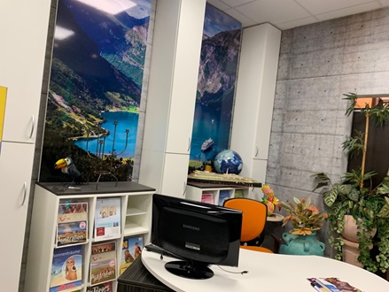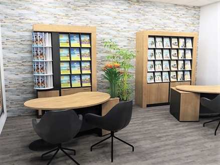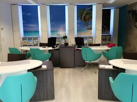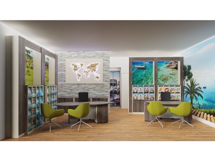 Zeitlos schöne Reisebüro Einrichtung mit drei Arbeitsplätzen.