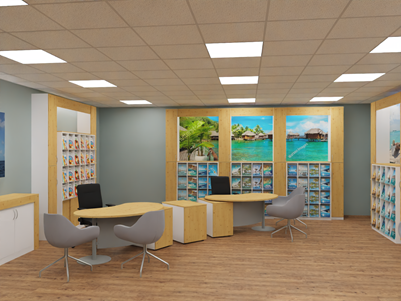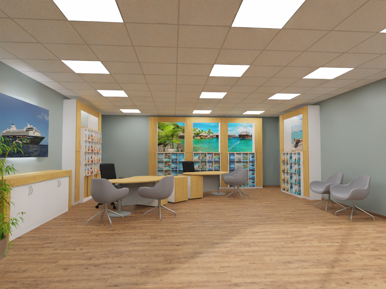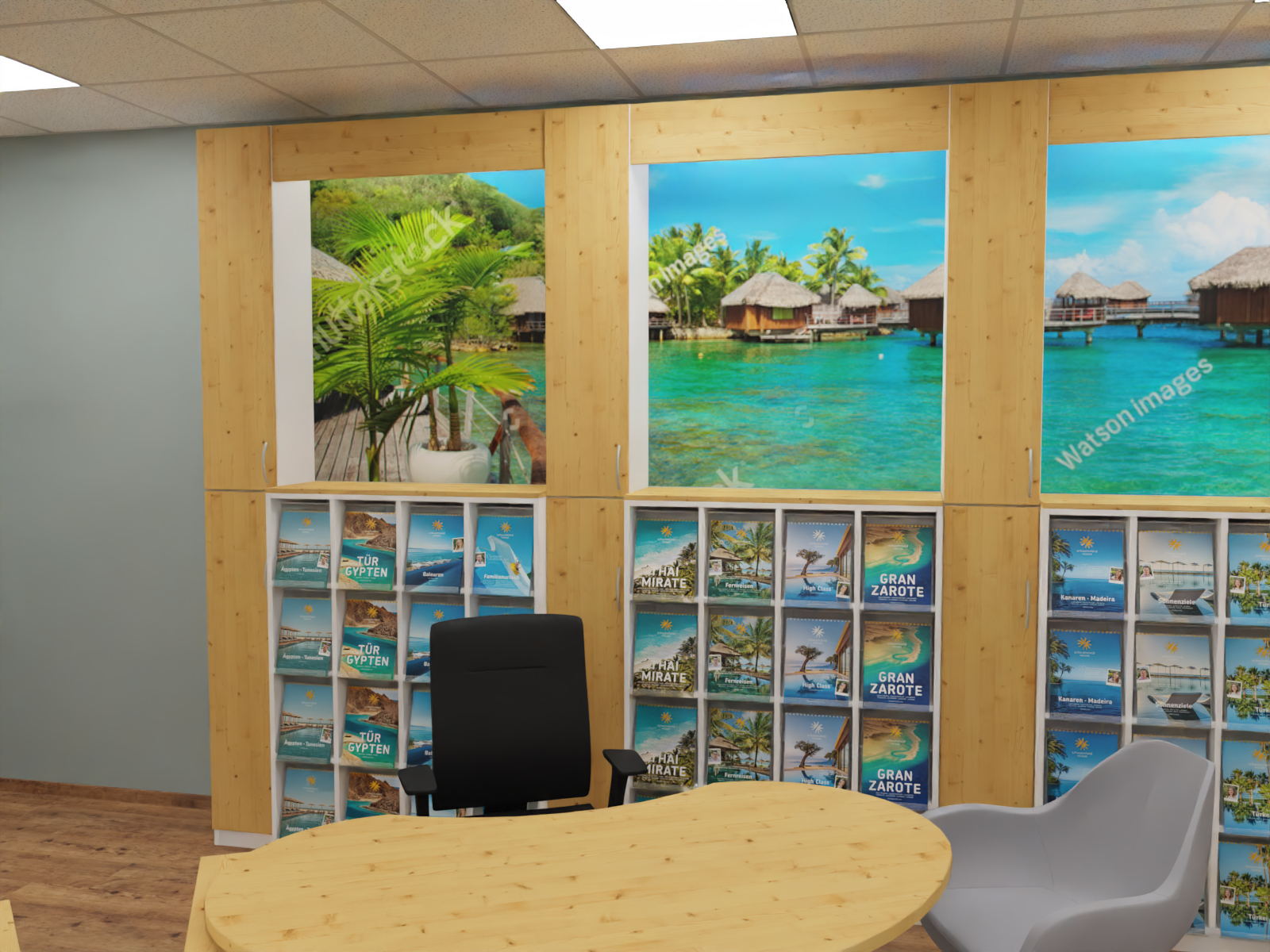 Prospektschränke mit Sommer- Wintereinteilung. Sideboards, 2x Reisebürocounter wie abgebildet oder ähnlich. Bestuhlung aus Secondhand Bestand oder neu. Verhandlungssache.