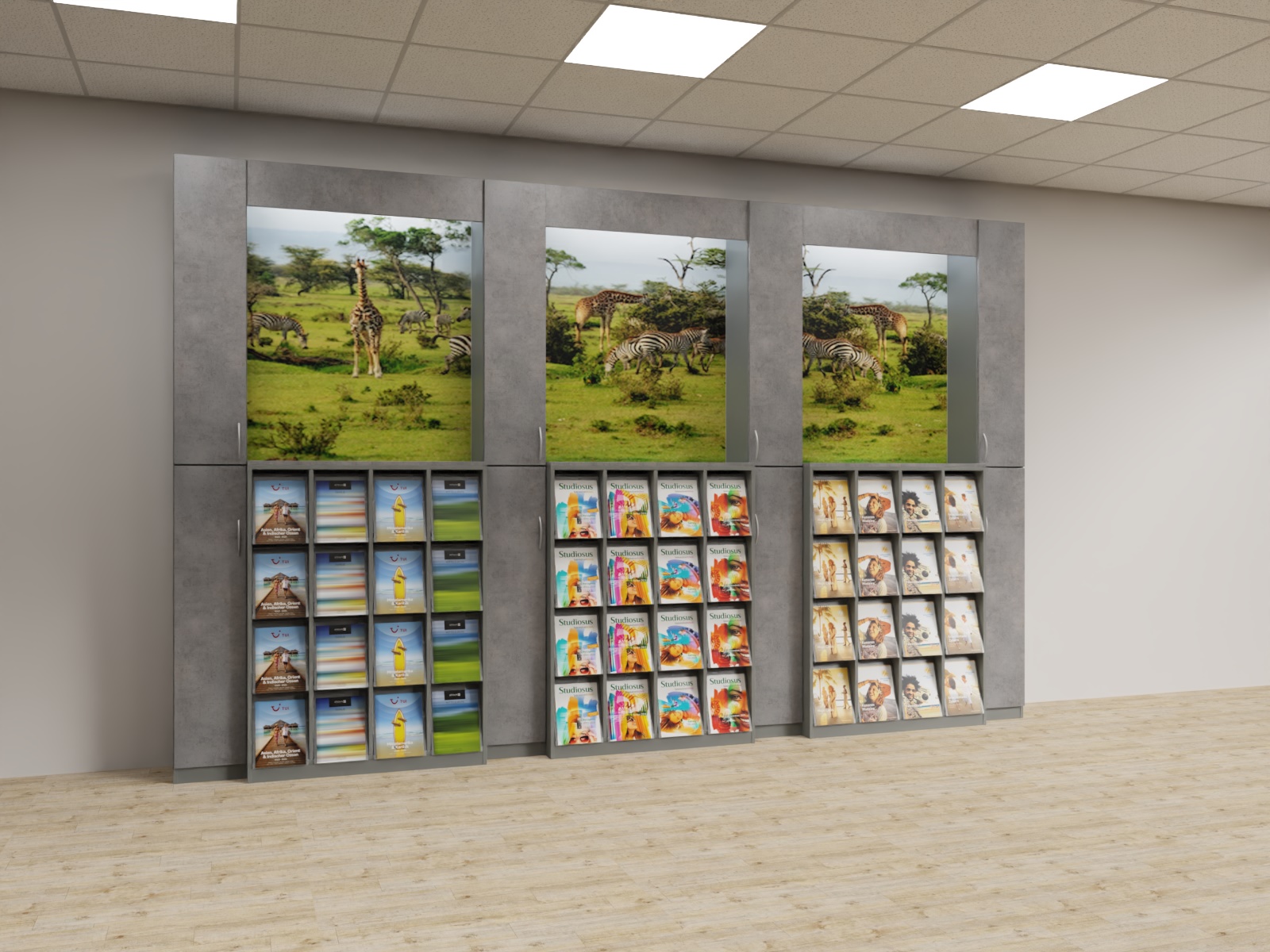 Variante 02 4x Funktionsäule, 3x K4x4 Prospektschrank, Bildrückwände, Lichtwinkel